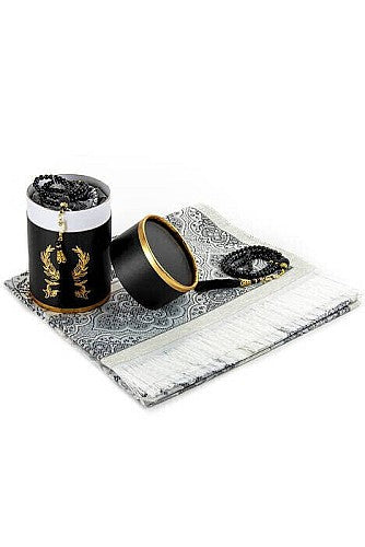 طقم سجادة صلاة وسبحة فاخر، يجمع بين التصميم التقليدي والراحة العصرية، مصنوع غالباً من قماش المخمل الناعم أو التفتة التركي، ومزين بنقوش المحراب الكلاسيكية. تتميز السجادة بخفة وزنها وسهولة حملها، وبعضها طبي مبطن لدعم المفاصل، مع سبحة متناسقة (99 حبة) لتعزيز التجربة الروحانية.