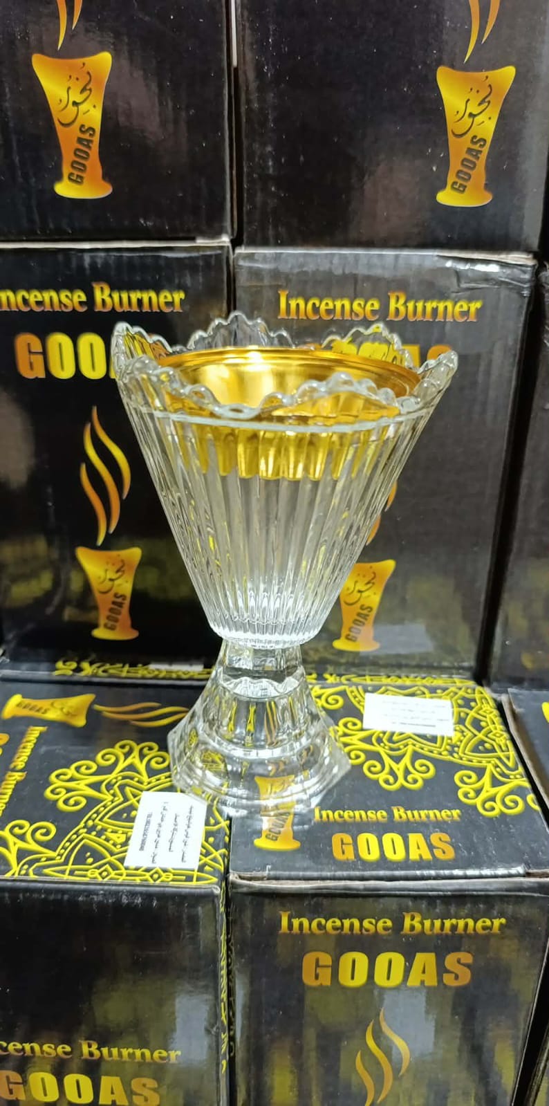 مبخرة أنيقة مصنوعة من الزجاج الشفاف بتصميم راقٍ، مع وعاء داخلي ذهبي يمنحها لمسة فخامة مميزة.