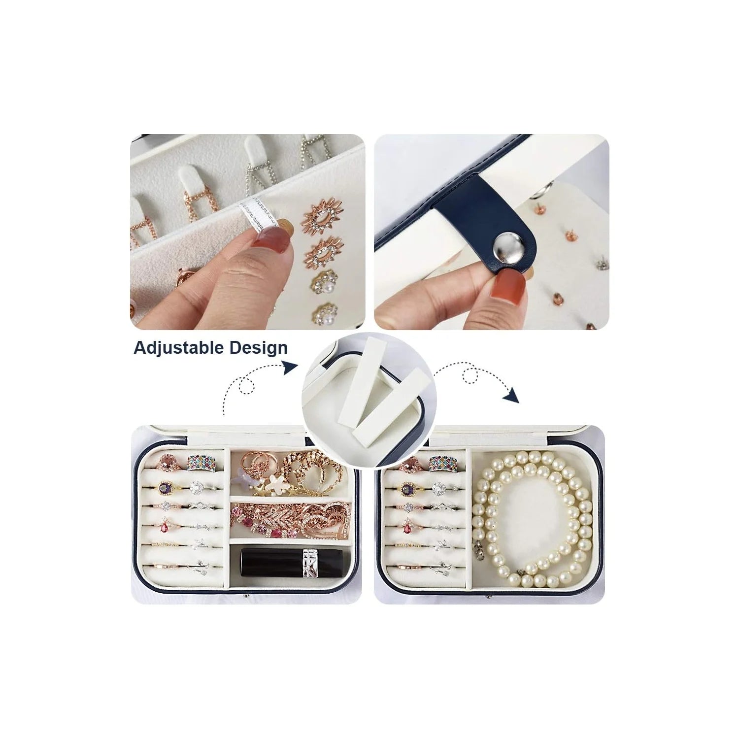 DESIGN CONVIVIAL ET ÉLÉGANT: notre boîte à bijoux portable est conçue avec deux couches, un panneau de chaîne, un panneau spécial pour boucles d'oreilles et anneaux pour organiser vos boucles d'oreilles et bagues. Les sections réglables peuvent être librement combinées pour s'adapter à vos différentes tailles d'effets personnels, gardant vos bijoux organisés et facilement accessibles.