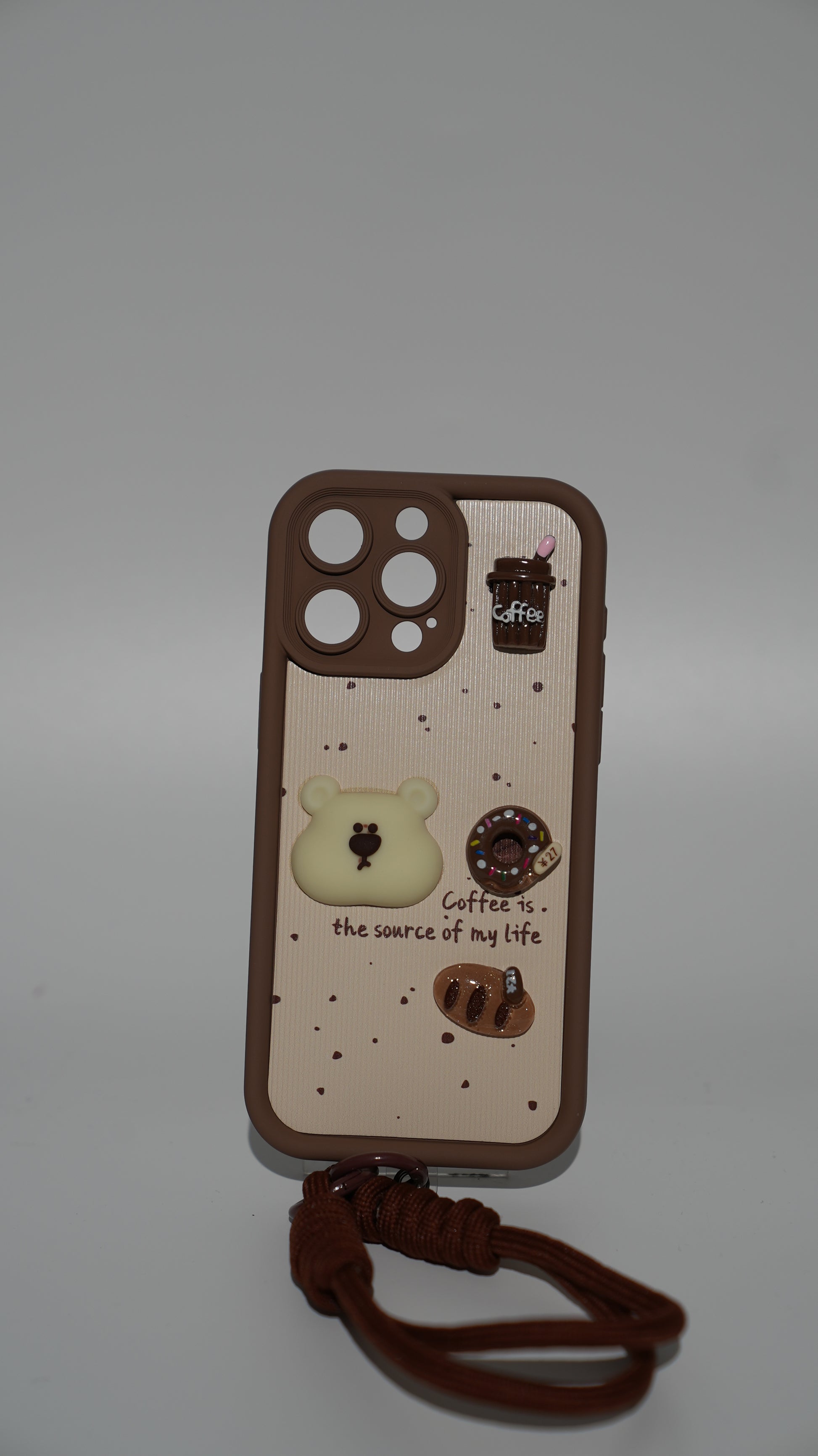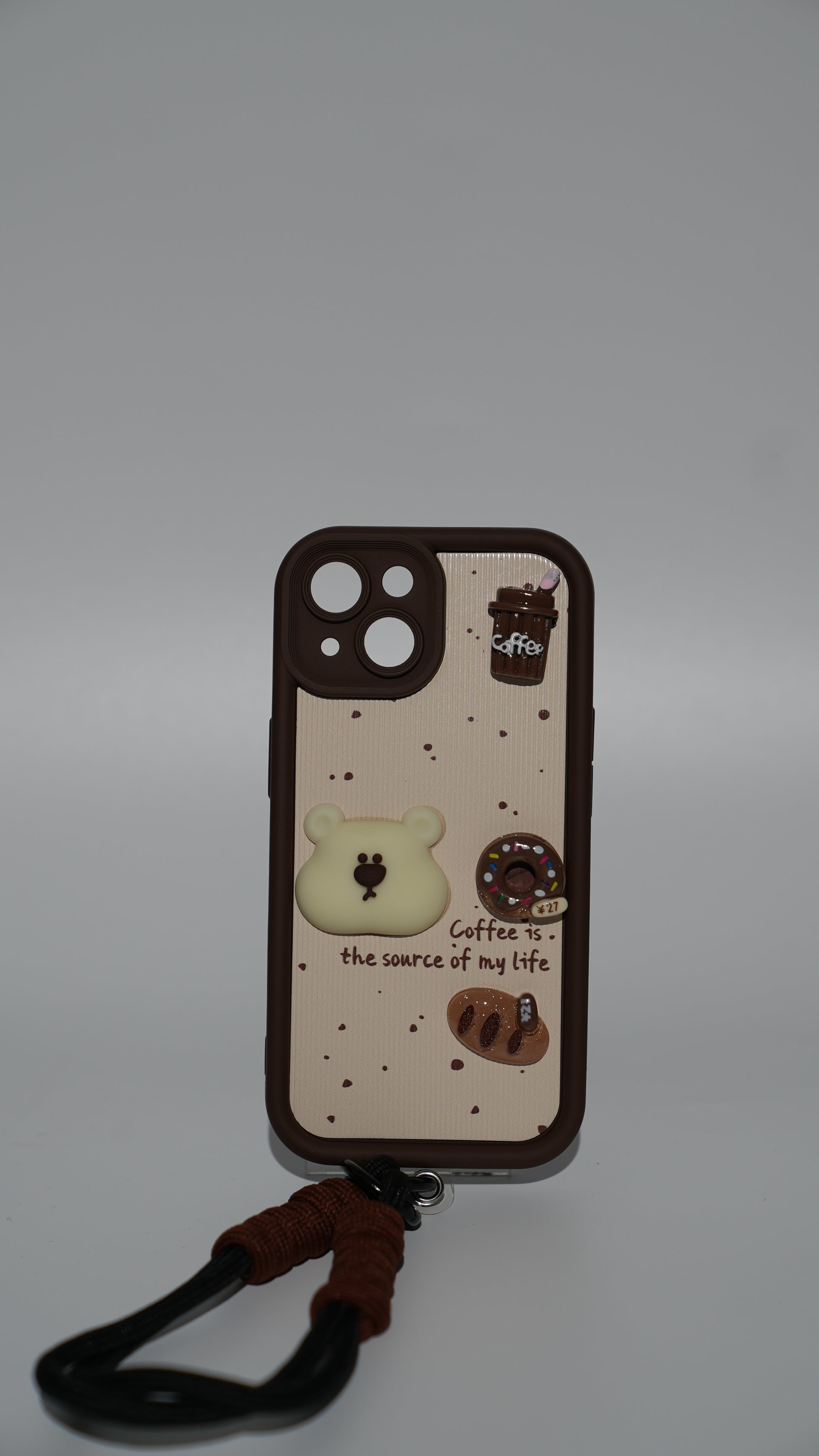 Le fond légèrement texturé et parsemé de petites taches façon pépites met en valeur les décorations en relief: une tête d’ours, un donut coloré, une boisson “coffee” et un biscuit gourmand.