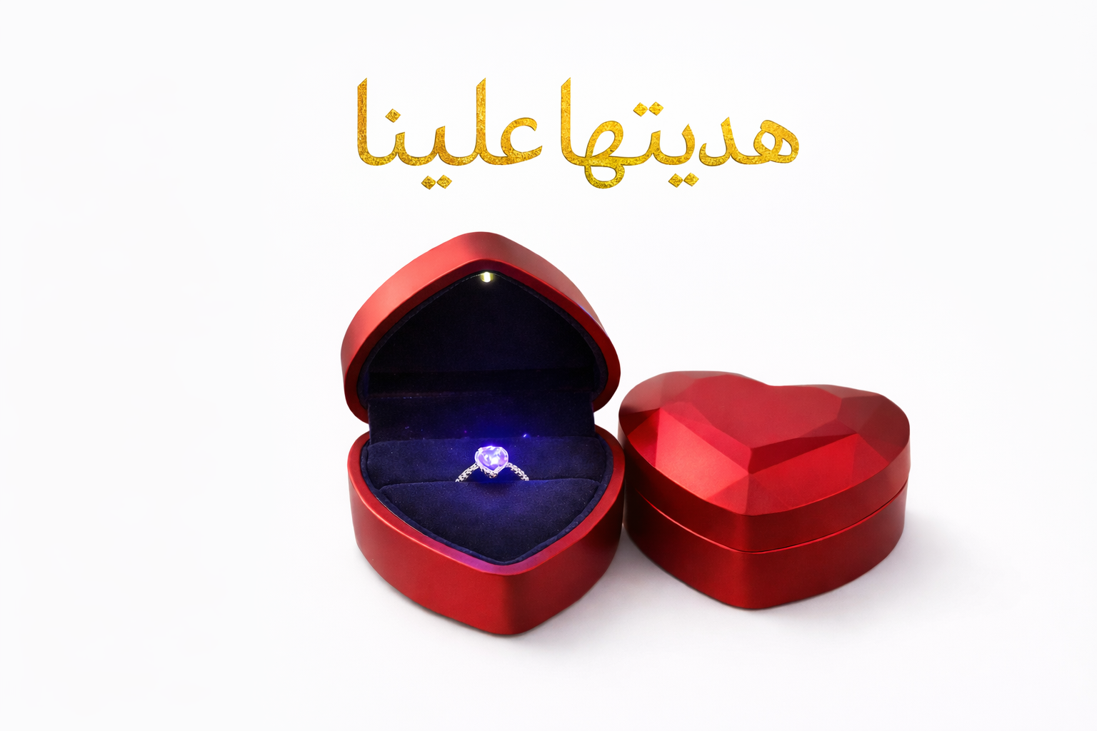 تأتي العلبة بتصميم أنيق باللون الأحمر، وتفتح لتكشف عن خاتم متلألئ مضاء بإضاءة LED ناعمة تضيف لمسة سحرية عند فتحها.