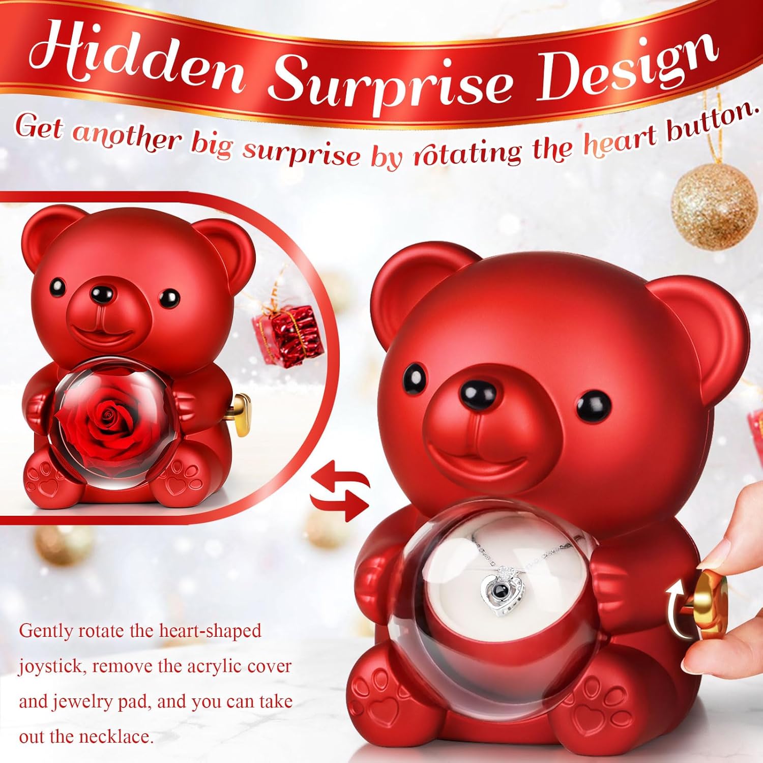 Tournez délicatement la rose pour révéler un collier en acier inoxydable 316L, disponible en trois élégantes finitions : or, argent, or rose. Personnalisez le pendentif avec des gravures de votre choix pour créer un cadeau vraiment unique et personnel.