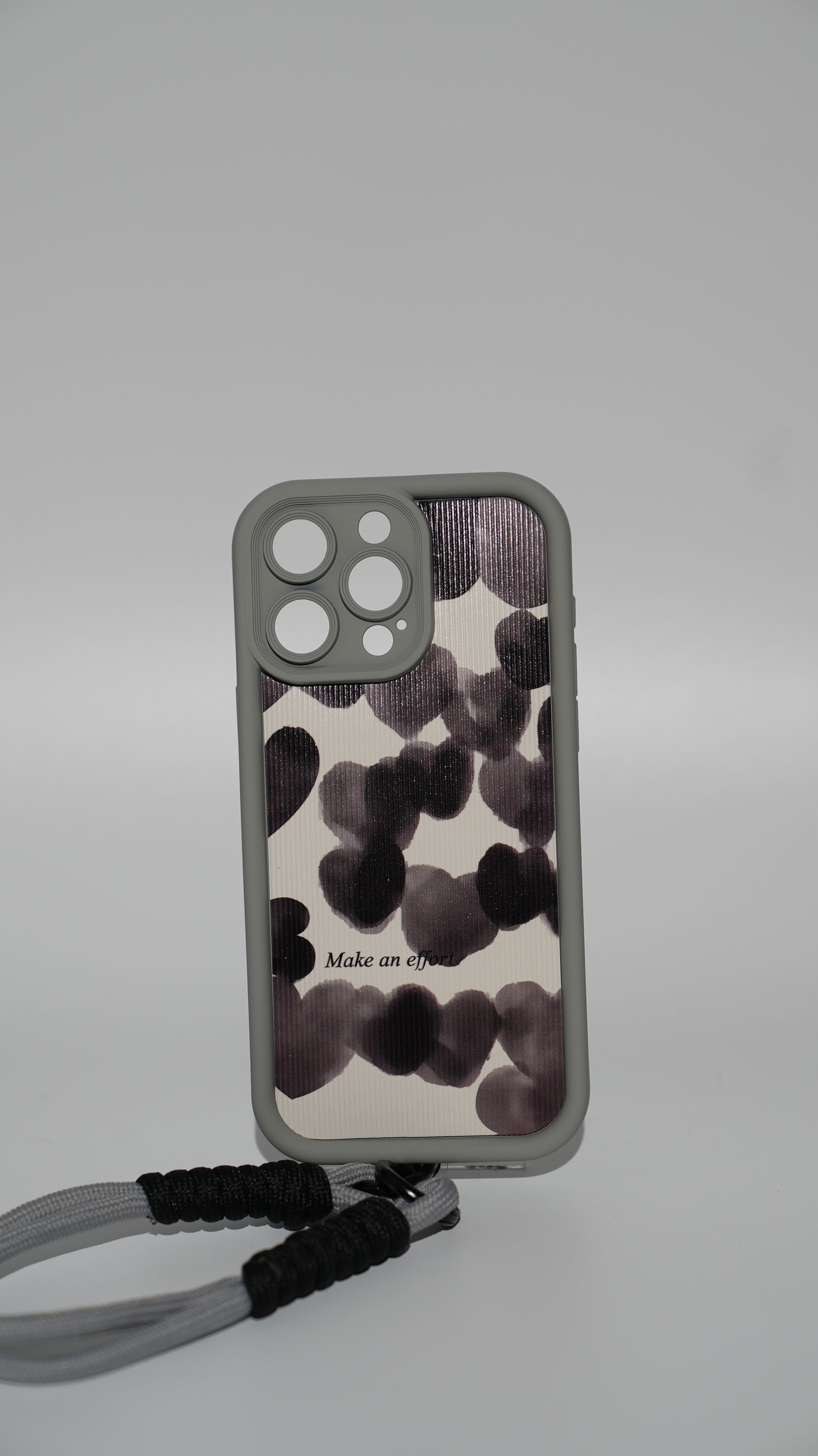 Son imprimé de cœurs en tons fumés (effet aquarelle) apporte une touche romantique tout en restant sobre et élégante. La surface présente un léger relief/effet texturé qui donne un rendu premium et agréable au toucher.